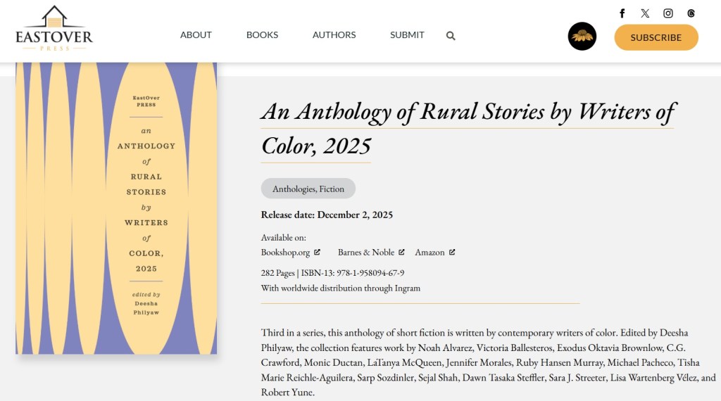 You can learn more (including how to pre-order a copy) here: You can learn more (including how to pre-order a copy) here: https://eastoverpress.com/book/an-anthology-of-rural-stories-by-writers-of-color-2025/