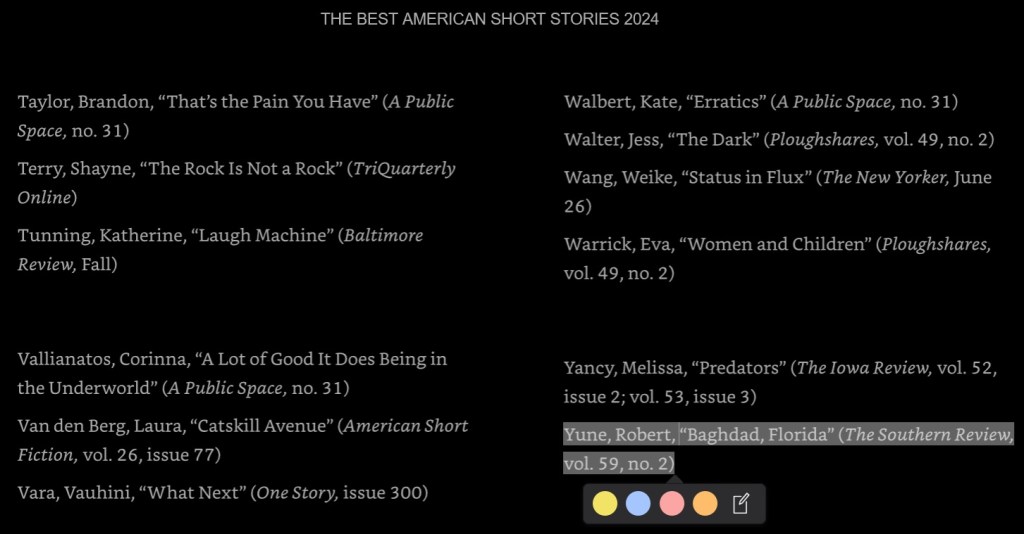 My story “Baghdad, Florida” is featured in the “other distinguished stories” section of The Best American Short Stories of 2024, edited by literary superhero Lauren Groff. Special thanks to Sacha Idell and The Southern Review.